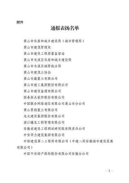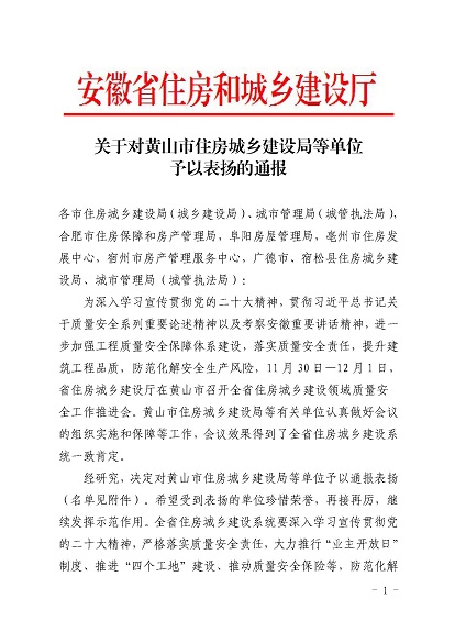 近日,安徽省住房和城鄉(xiāng)建設(shè)廳印發(fā)《關(guān)于對(duì)黃山市住房和城鄉(xiāng)建設(shè)局等單位予以表?yè)P(yáng)的通報(bào)》,《通報(bào)》指出,11月30日-12月1日,省住房和城鄉(xiāng)建設(shè)廳在黃山市召開(kāi)全省住房建設(shè)領(lǐng)域質(zhì)量安全工作推進(jìn)會(huì),會(huì)議效果得到全省住房城鄉(xiāng)建設(shè)系統(tǒng)一致肯定,并對(duì)在此次會(huì)議認(rèn)真做好組織實(shí)施和保障的單位予以通報(bào)表?yè)P(yáng),黃山市建工集團(tuán)股份有限公司作為唯一一家本土建筑施工企業(yè)榮獲表?yè)P(yáng)。