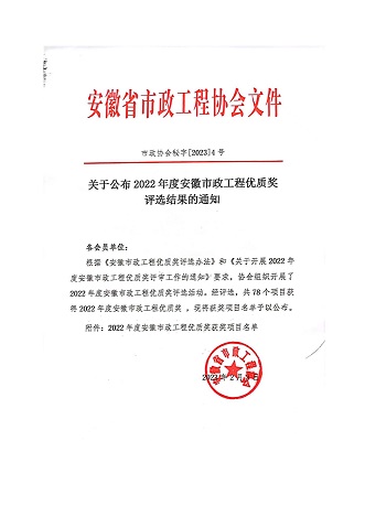根據(jù)《安徽市政工程優(yōu)質(zhì)獎評選辦法》和《關(guān)于開展2022年度安徽市政工程優(yōu)質(zhì)獎評審工作的通知》要求,安徽省市政工程協(xié)會組織開展了2022年度安徽市政工程優(yōu)質(zhì)獎評選活動。黃山市建工集團(tuán)股份有限公司承建的黟縣五里轉(zhuǎn)盤至開發(fā)區(qū)段道路及雨污管網(wǎng)升級改造項目榮獲2022年度安徽市政工程優(yōu)質(zhì)獎。
