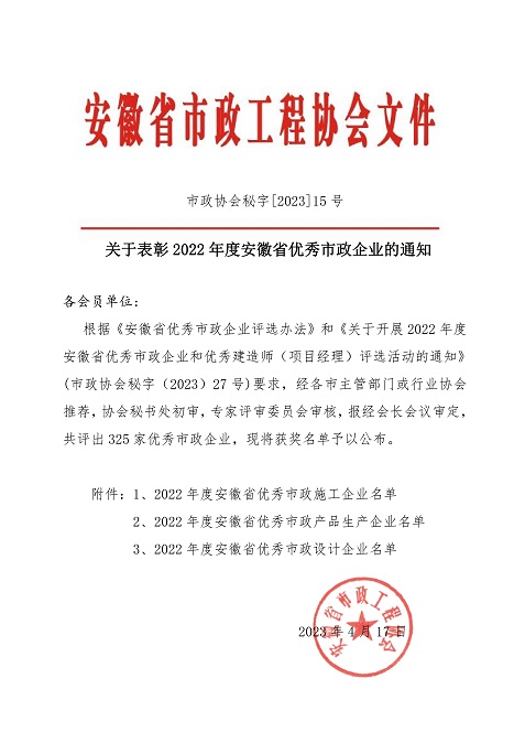 近日,安徽省市政工程協(xié)會公布了“2022年度安徽省優(yōu)秀市政施工企業(yè)”名單。黃山建工集團股份有限公司被安徽省市政協(xié)會評為“2022年度安徽省優(yōu)秀市政企業(yè)”。該項榮譽是由各市主管部門或行業(yè)協(xié)會推薦,經(jīng)省市政協(xié)會秘書處初審,專家評審委員會審核,安徽省市政工程協(xié)會最終審定。
